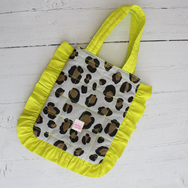 Bold and bright leopard print quilted tote bag with frill. The perfect fun accessory for all ages!