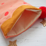 Screen printed in neon red and gold onto 100% cotton and finished with a handmade neon red pompom.