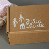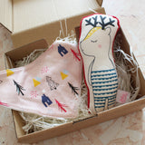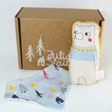 Lovely baby gift set - a Forest Friends rattle and organic cotton bib presented in a hand printed box.