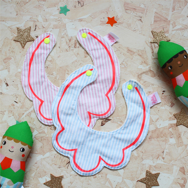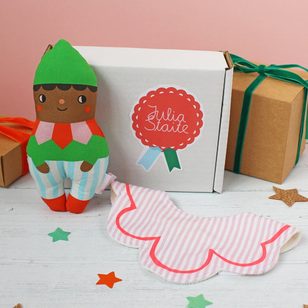 A sweet and bright gift for little ones, this set contains a Christmas elf rattle soft toy and a striped bib with screen printed detail. Lovingly wrapped in tissue paper and presented in a white gift box.